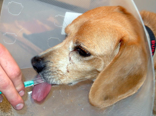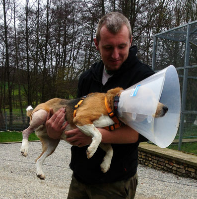 Leider war die Diagnose für unseren Buddy nicht gut. Er hatte sich einen Kreuzbandriss zugezogen und musste operiert werden. Für unseren älteren etwas kurpulenten Hundemann sind nun die ersten Tage nach der Operation alles andere als angenehm. Er leidet sehr, mag nicht selbständig essen und nicht trinken.. Wir bringen ihn mehrmals täglich an die frische Luft, füttern ihn aus der Hand und geben ihm stündlich etwas Wasser aus der Spritze. Er genießt unsere Zuwendung und Pflege sehr. Es tut uns unheimlich weh Buddy so leiden zu sehen! Womit hat der herzallerliebste Hundebub das nur verdient? Zuerst Tierheim und etzt auch noch sowas! Wir wünschen unserem Senior nicht mehr als ein Kuschelplätzchen an der Seite von liebevollen Menschen..