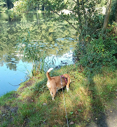 Benny hatte sich nach kurzer Zeit sehr gut eingelebt und durch viele lange Waldspaziergänge, den ehemals verletzten Hinterlauf wieder mit Muskulatur gut aufgebaut.