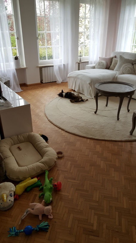 Noch in weiteres Highlight: Er weiss dass am Tisch (wenn wir essen) nicht gebettelt werden darf! Er schleicht herum legt sich aber dann meistens aufs Kissen in unserer Nähe und schläft/wartet.