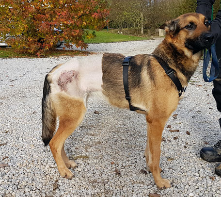 Die Schäfi-Mix Hündin Mathilda wurde angefahren auf der Autobahn gefunden und ins Tierheim gebracht. Da die arme Maus starke Schmerzen hatte und hinten nicht auftreten konnte wurde sie umgehend dem Tierarzt vorgestellt, der einen Riss im Becken diagnostizierte und sie mit der Aussage, dass das von selbst verheile zurück ins Tierheim schickte. Dort "lag" sie nun in der Eiseskälte, unsere arme Mathilda, konnte trotz starker Schmerzmittel nicht selbständig aufstehen und von ihren Besitzern war weit und breit auch keine Spur! Der Tierheimleiter alarmierte uns nach ein paar Tagen mit den Worten: Der Hund hat extreme Schmerzen und es wird einfach nicht besser! Als wir sie sahen, zerbrach es uns das Herz, völlig abgemagert bis auf die Knochen und wimmernd vor Schmerzen lagsie da, wie ein Häufchen Elend! Wir liesen sie umgehend in eine Spezialklinik bringen, wo leider nicht nur ein "Riss" im Becken, sondern eine Trümmerfraktur, zuzätzlich noch eine beidseitige Darmkreuzbeinluxation und ein Schwanzabriss diagnostiziert wurde! Mathilda wurde sofort operiert! Wir möchten uns nicht vorstellen, unter welchen Schmerzen das arme Mädchen litt.